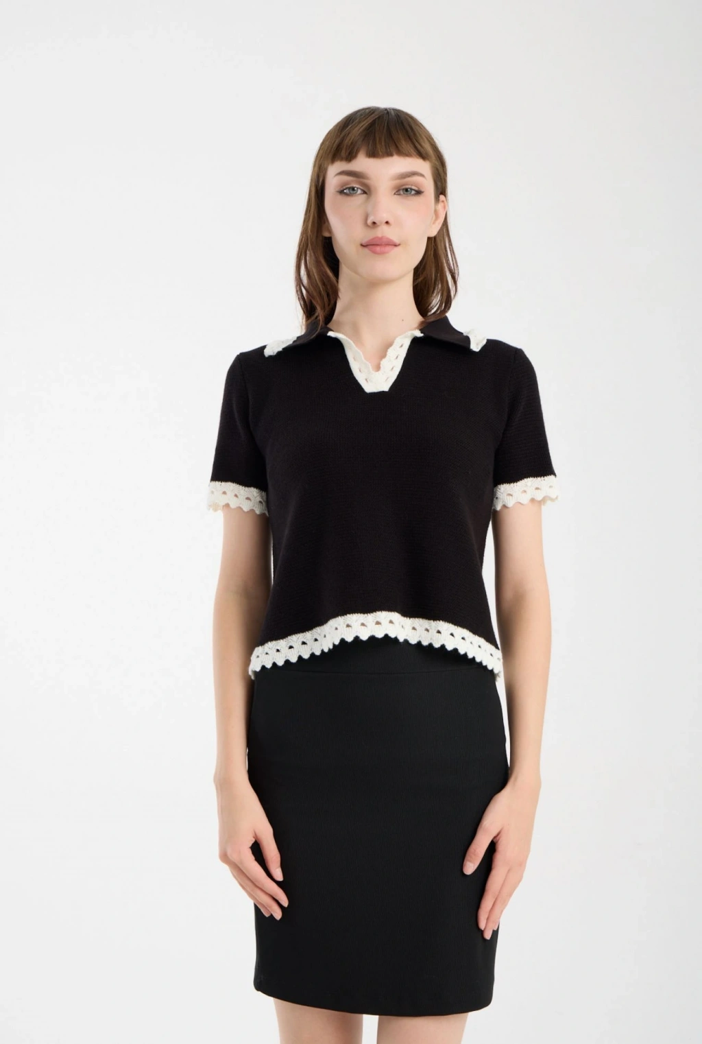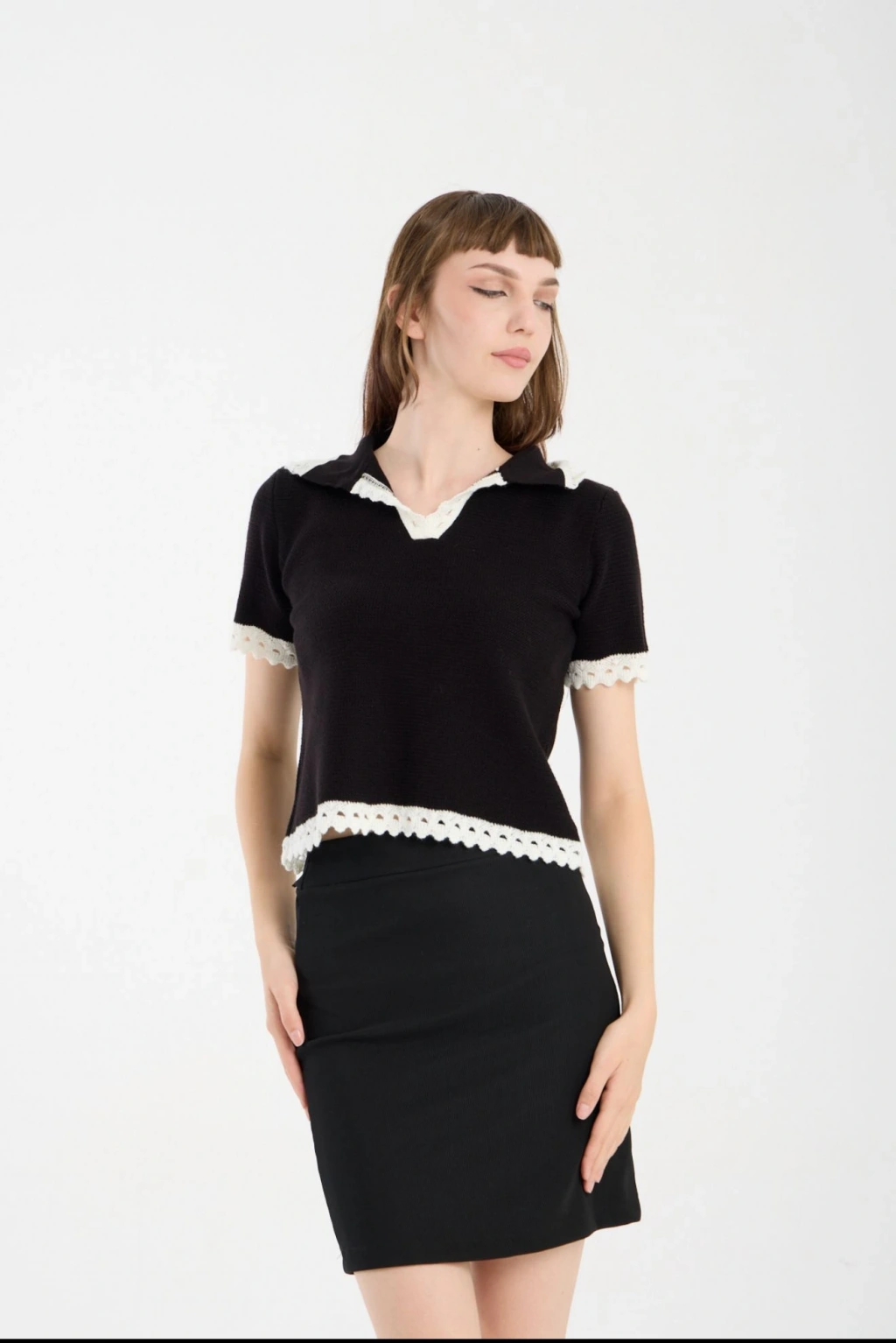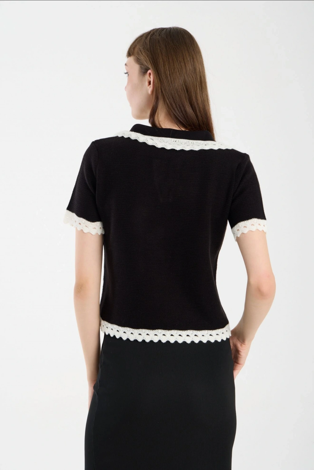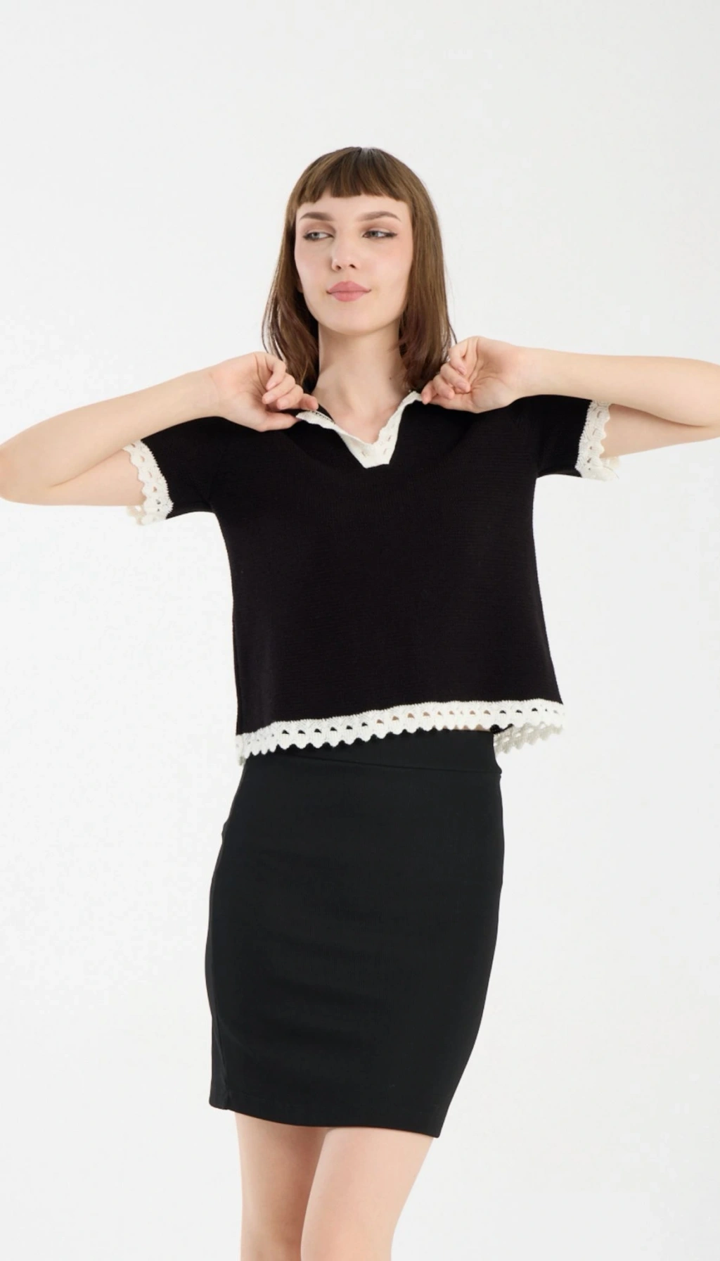 Siyah Yakası Dantelli Kısa Kollu Kazak