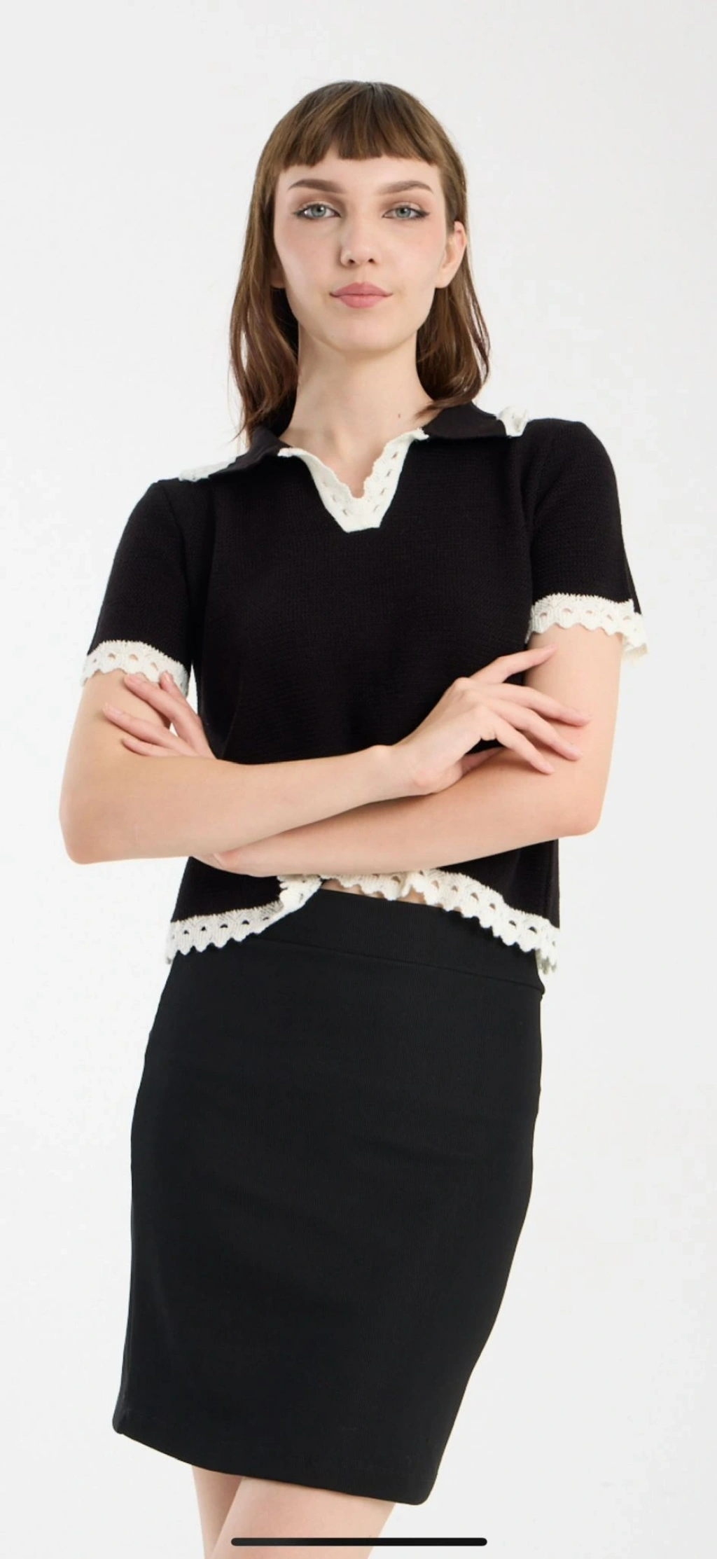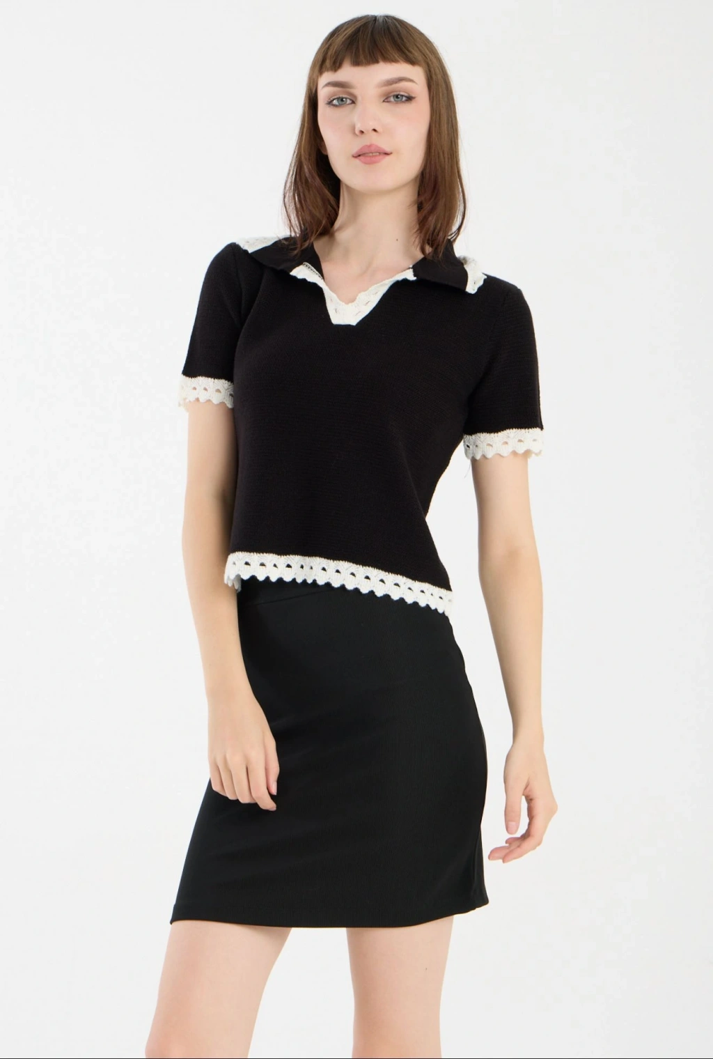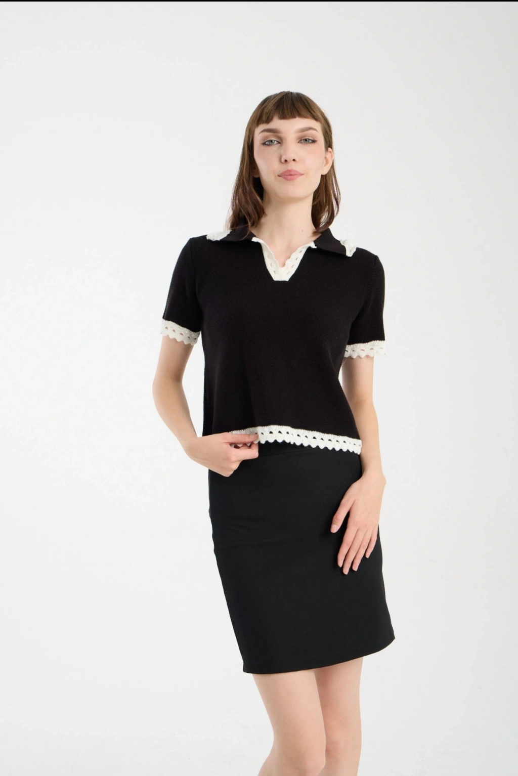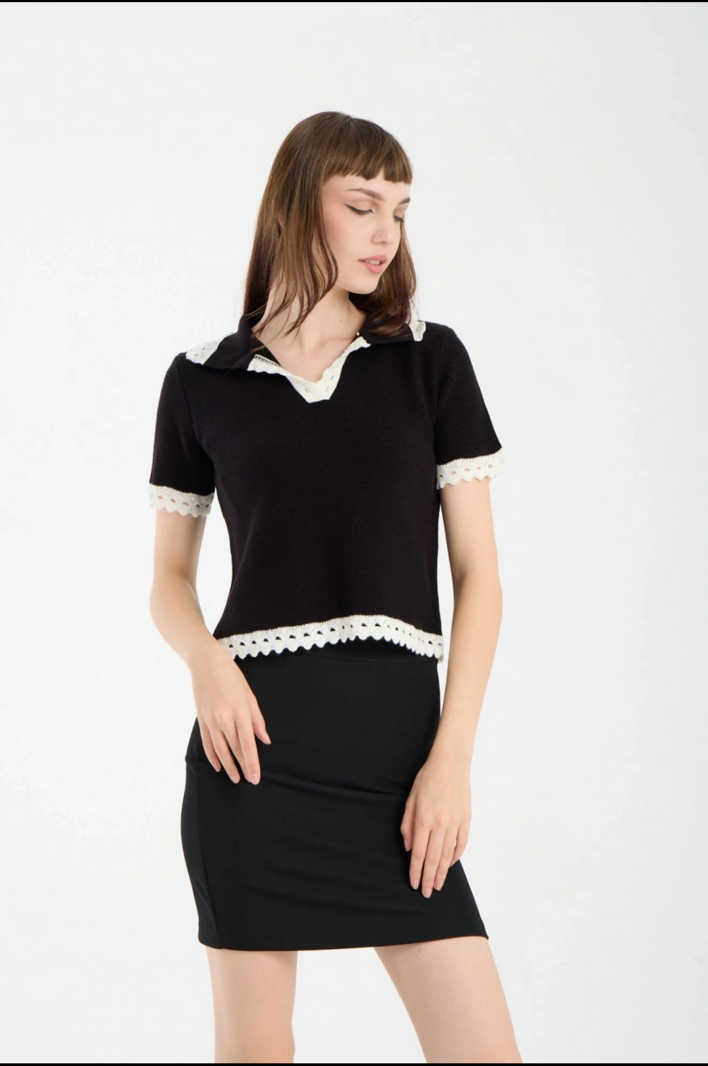 Siyah Yakası Dantelli Kısa Kollu Kazak