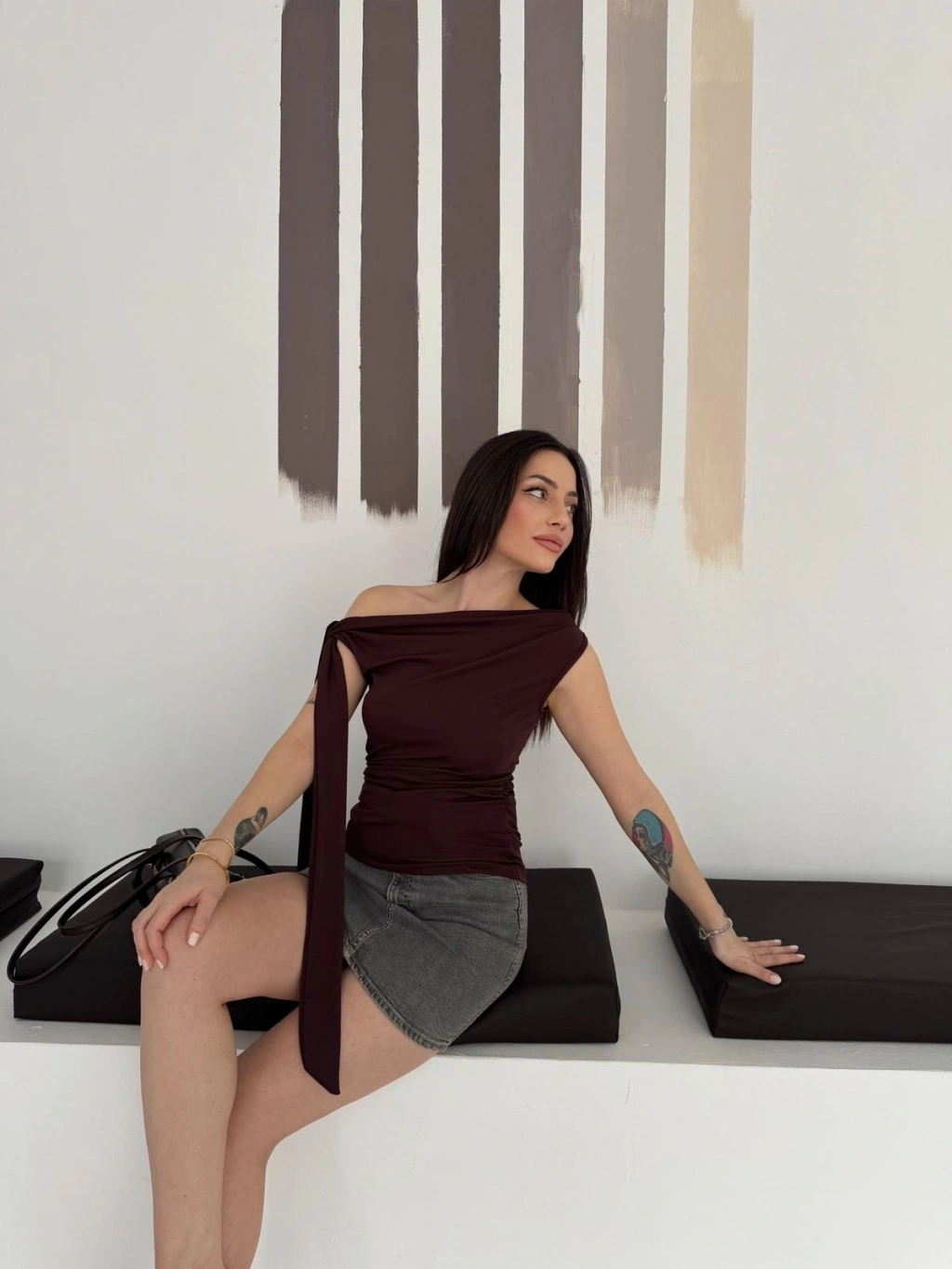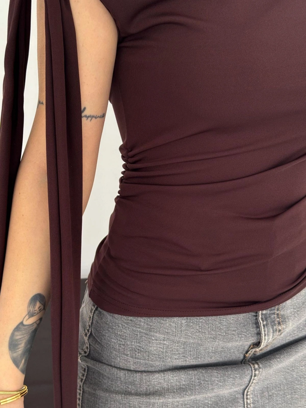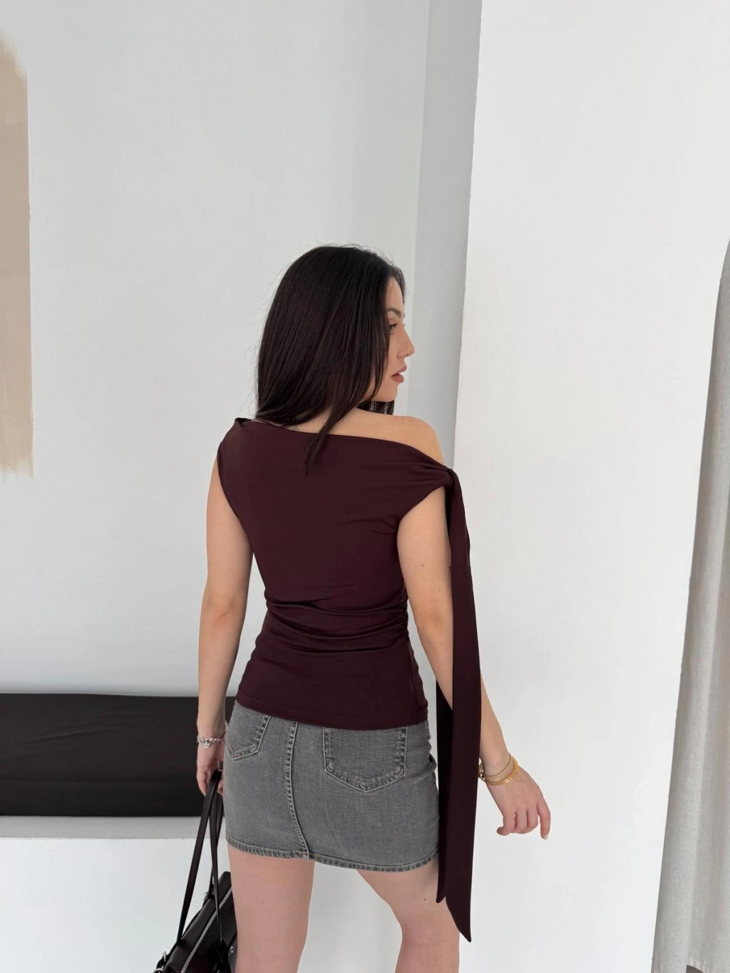 Kahverengi Kısa Kollu Tek Omuz Bluz