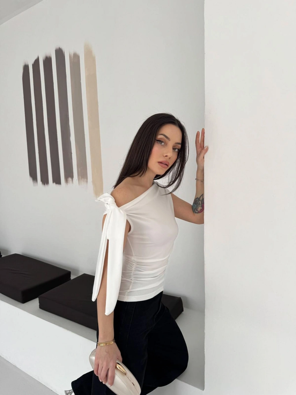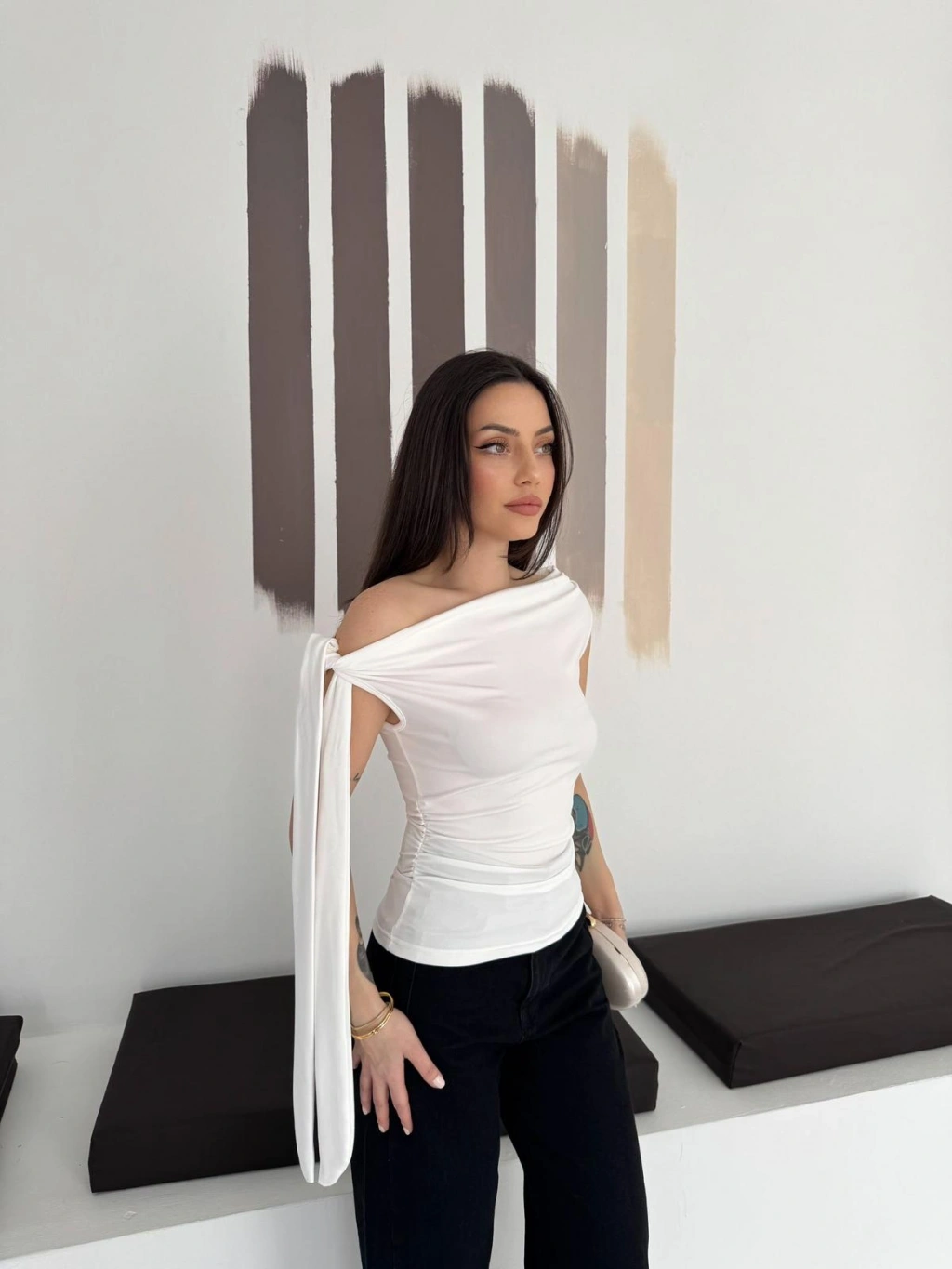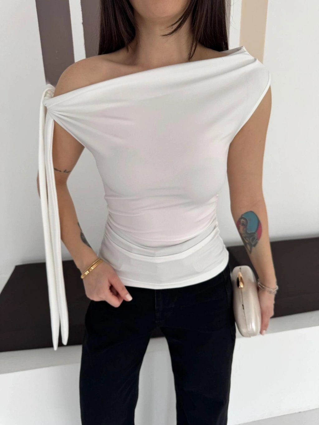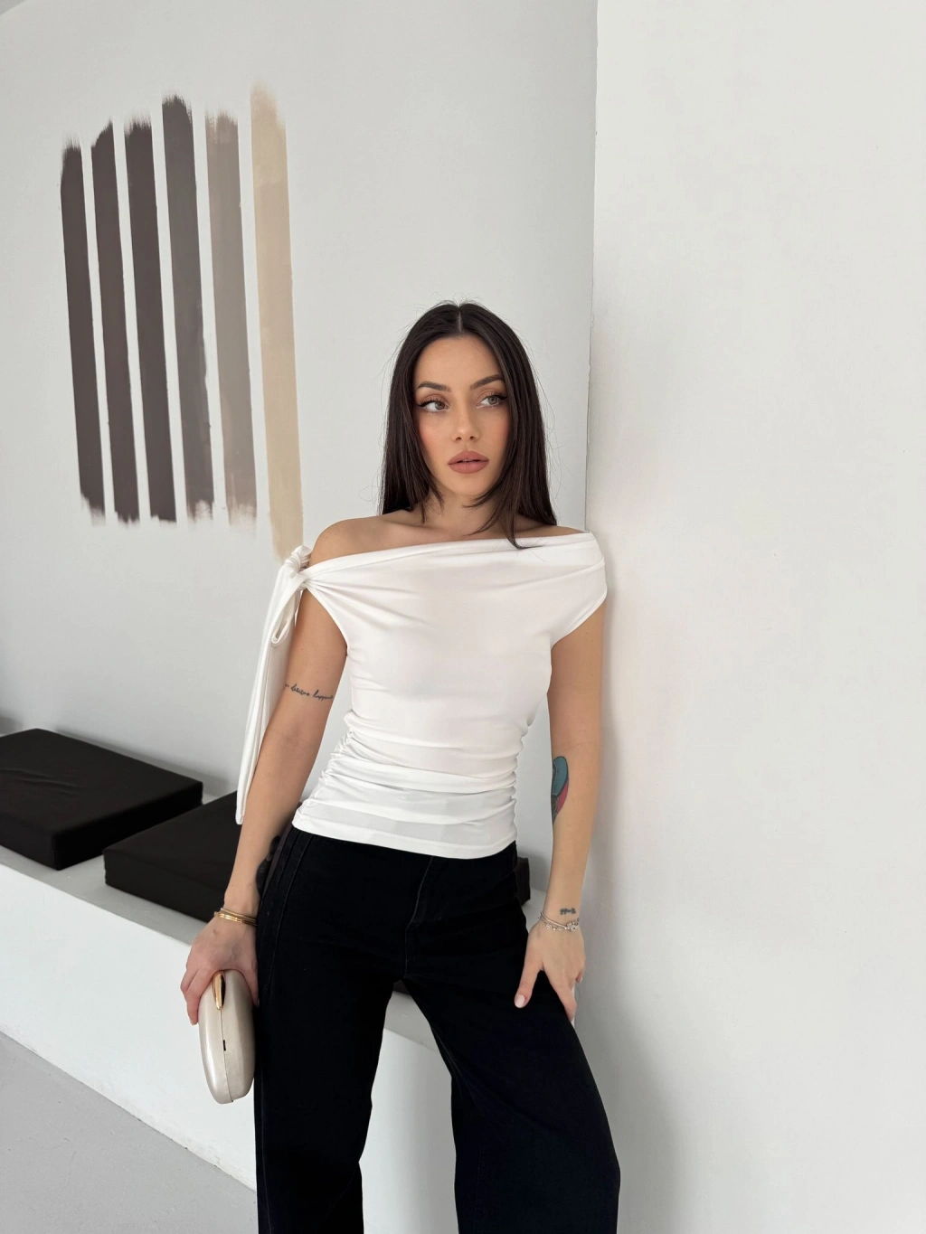 Beyaz Dalgıç Omuz Bağlamalı Bluz